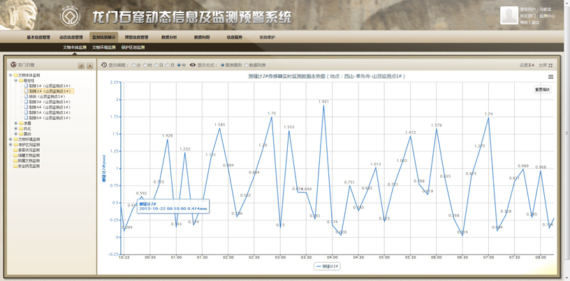 龙门石窟动态信息及监测预警系统第一期软件系统已正式上线,已将前端传感器数据全部采集入库,实时在线显示,对存在的软件BUG进行了及时更正,目前系统已顺利在龙门石窟本地运行。